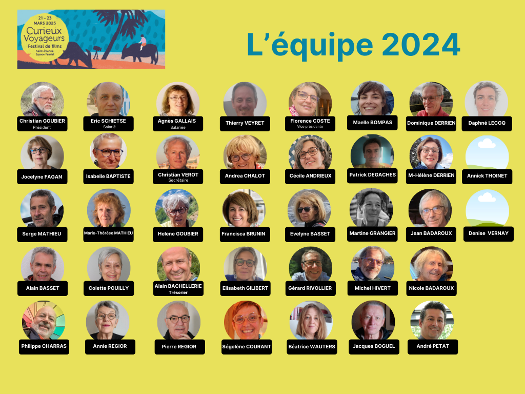 L’équipe du festival réunit des voyageurs passionnés dont les périples, s’ils s’inscrivaient sur une mappemonde, la couvriraient de fils où s’accrocheraient les perles de leurs rencontres : Bolivie, Japon, Costa Rica, Gabon, Namibie, Mongolie, Afrique du Sud, USA, Brésil, Oman, Iran, Islande, Argentine, Alaska, Cuba, Zimbabwe, Serbie, Turquie, Chine, Vietnam, Inde, Burkina-Faso,…