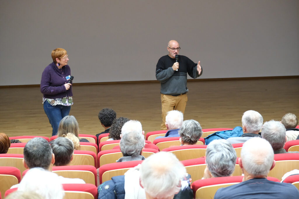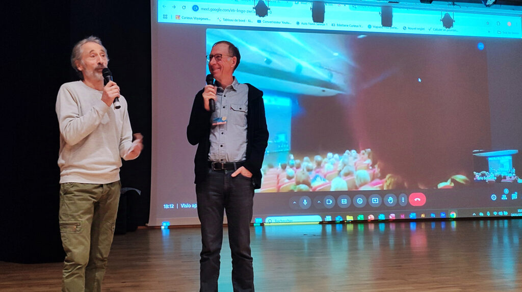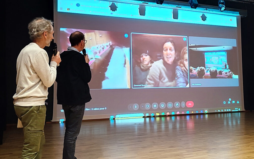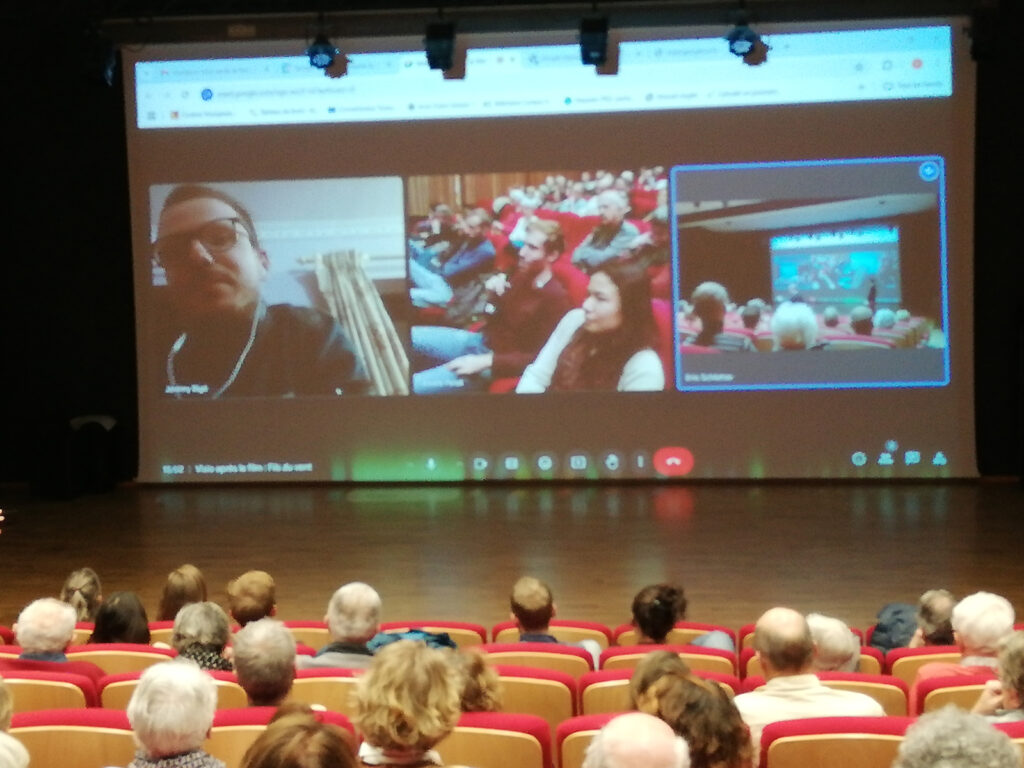 - Des échanges passionnants avec les réalisateurs, qu’ils soient sur place ou en visio. Un très grand merci à Jean-François Tuso (« Kéré, un photographe dans le sud de Madagascar« ) et à Christian Lemuet (« 3 vélos pour 5, l’Amérique tout au sud« ) qui nous ont fait l’amitié de venir à Andrézieux. C’était un plaisir de les retrouver après leur venue au festival en mars dernier. Les échanges en visio ont également bien fonctionné avec Jérémy Bigé (« Fils du vent« ) depuis Katmandou ainsi qu’avec la famille voyageuse de « 3 vélos pour 5 » au grand complet et désormais en voilier au large de l’île de Baffin au Canada,