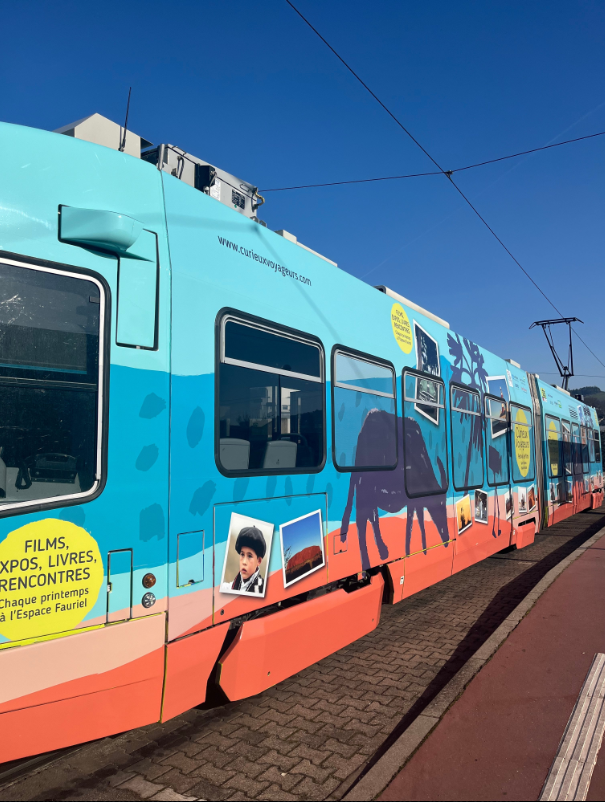 Depuis le 1er mars, un tram aux couleurs de Curieux Voyageurs circule dans Saint-Étienne. Après une première visibilité donnée l’an passé grâce à des photos apposées sur les vitres d’une rame, le festival a cette année l’honneur d’un « covering » complet.
