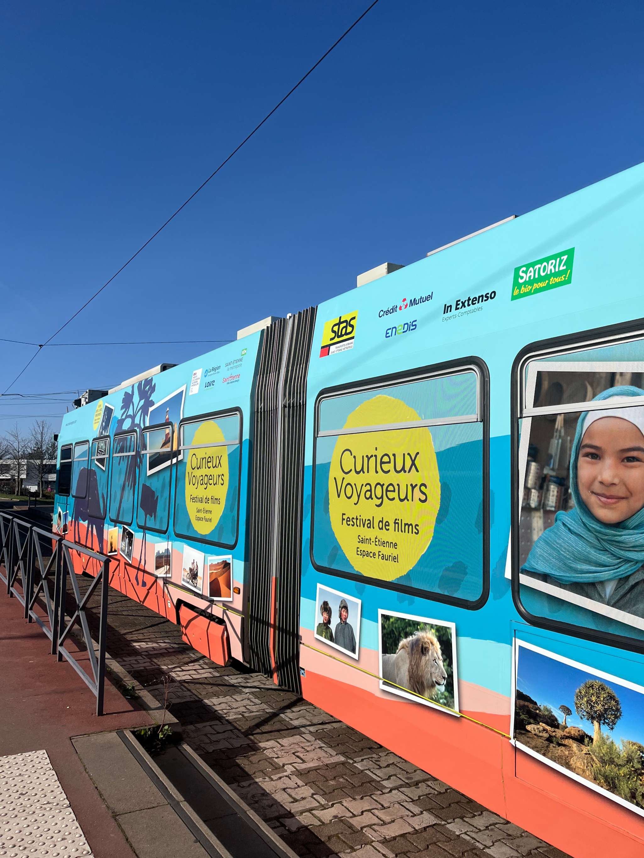 Depuis le 1er mars, un tram aux couleurs de Curieux Voyageurs circule dans Saint-Étienne. Après une première visibilité donnée l’an passé grâce à des photos apposées sur les vitres d’une rame, le festival a cette année l’honneur d’un « covering » complet.